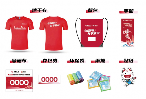 选手装备包括:运动速干衣、背包、手册、号码布、环保袋、一次性雨披、贴纸