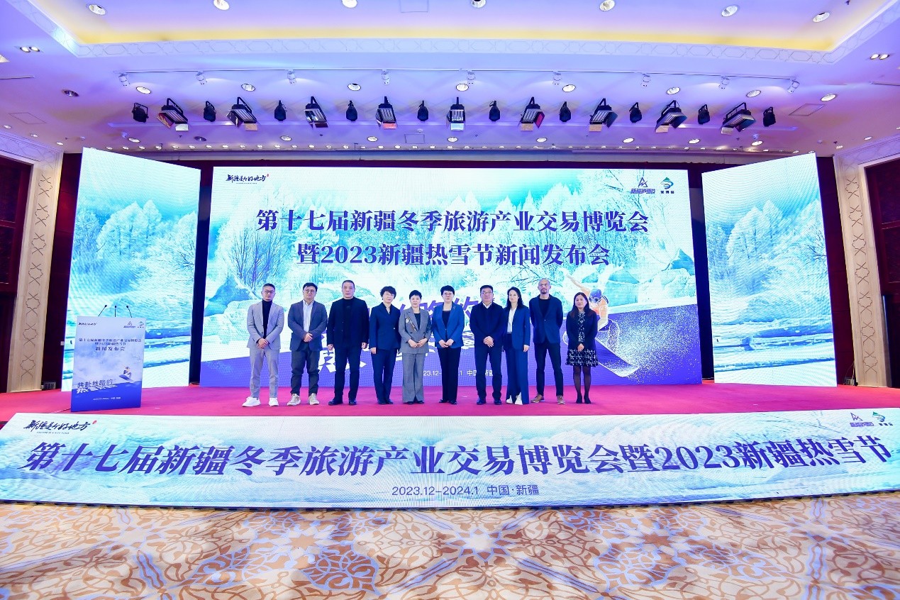 11月17日,第十七届新疆冬季旅游产业交易博览会暨2023新疆热雪节(以下简称:新疆冬博会暨热雪节)在北京召开新闻发布会。新疆维吾尔自治区文化和旅游厅党组成员、副厅长余洁作新闻发布,新疆文旅投集团党委副书记、董事、总经理刘让群发布招商招展及配套活动等相关情况,乌鲁木齐市人民政府副秘书长廖文钰、阿勒泰地区行署副专员潘峰分别发布乌鲁木齐市及阿勒泰地区冬季文旅配套活动和相关优惠政策,资深滑雪达人、冷山和GOSKI的创始人赖刚向全国、全世界雪友发出邀请,“冬季到新疆来滑雪”。