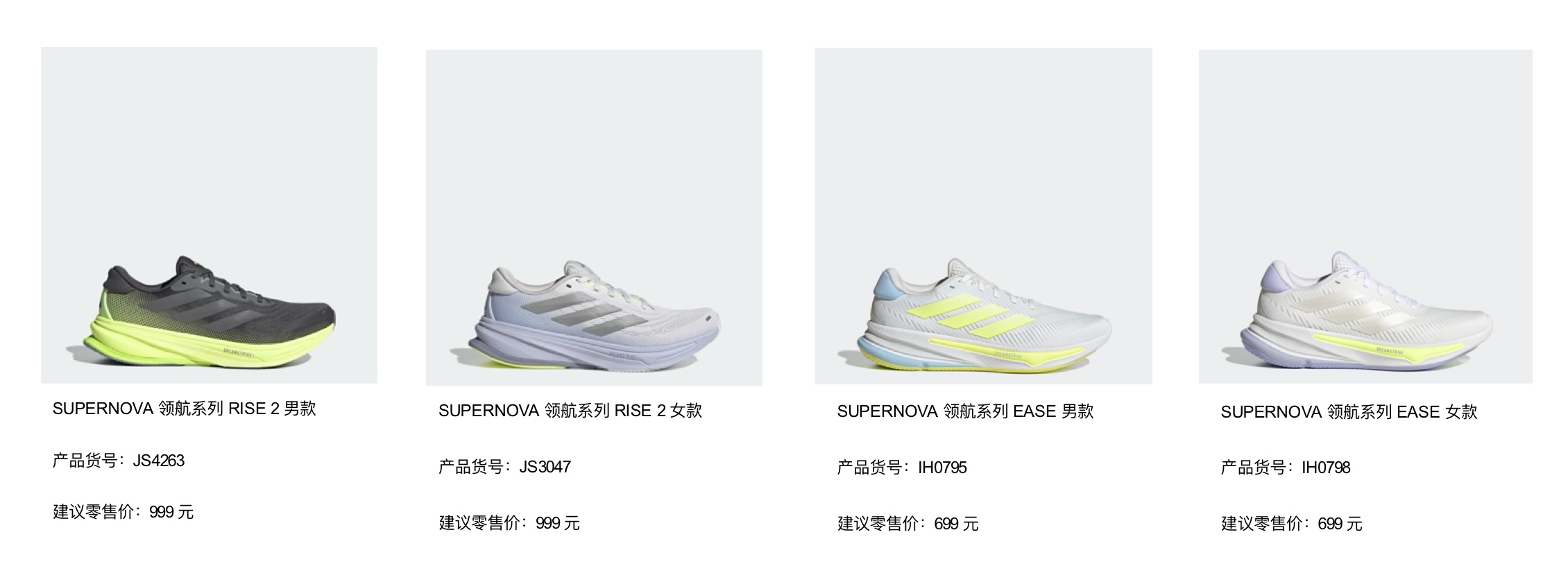 SUPERNOVA领航系列涵盖多款慢跑鞋产品,包含加宽中底提供稳定支撑的SUPERNOVA PRIMA、搭配防水鞋面与防滑大底的SUPERNOVA GORE-TEX、性价比优选SUPERNOVA EASE以及全新升级的日常慢跑优选SUPERNOVA RISE 2,为跑者提供多样化的选择。
