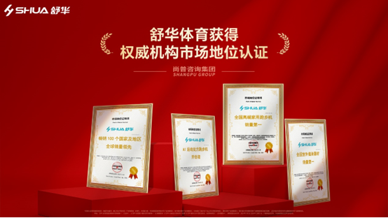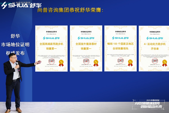 发布会现场,来自于独立第三方咨询机构为舒华体育授予“畅销100个国家及地区,全球销量领先”“全国高端家用跑步机销量第一”“全国室外健身器材销量第一”“舒华 AI运动处方跑步机开创者”四大权威市场地位证明,用市场数据彰显了舒华体育在国内外市场的领先地位。