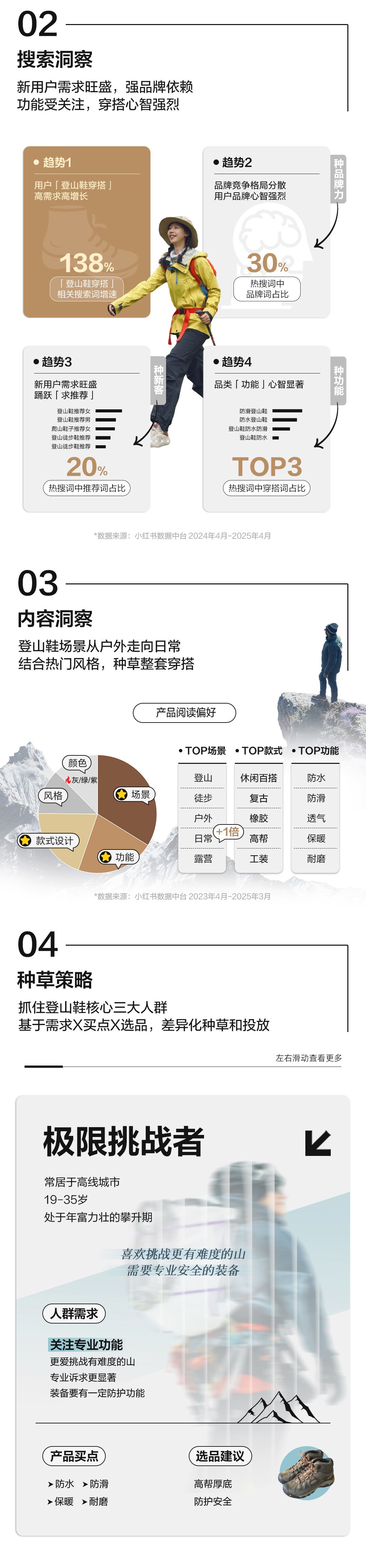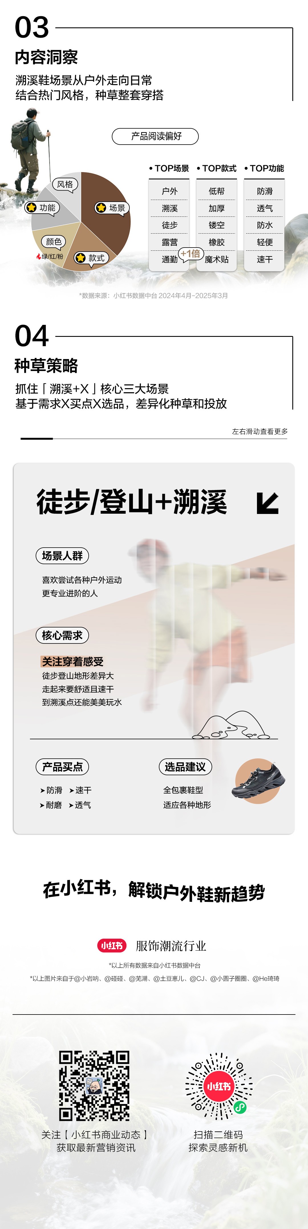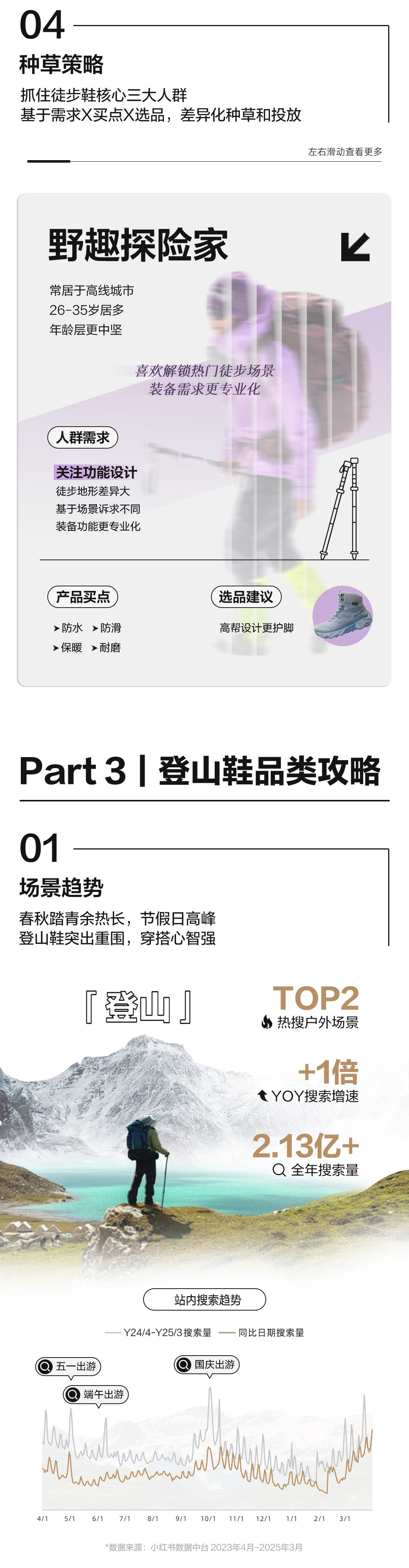 本期小红书带来「户外鞋品类洞察&营销指南」,通过对户外趋势的深度洞察,聚焦户外鞋品类中「徒步鞋、登山鞋、溯溪鞋」三大热门品类,从场景需求、搜索动向、内容趋势到策略打法,全方位拆解品类增长密码。为品牌提供从精准定位到高效转化的全链路营销指南,助力品牌把握户外场景趋势,抢占品类增长制高点。