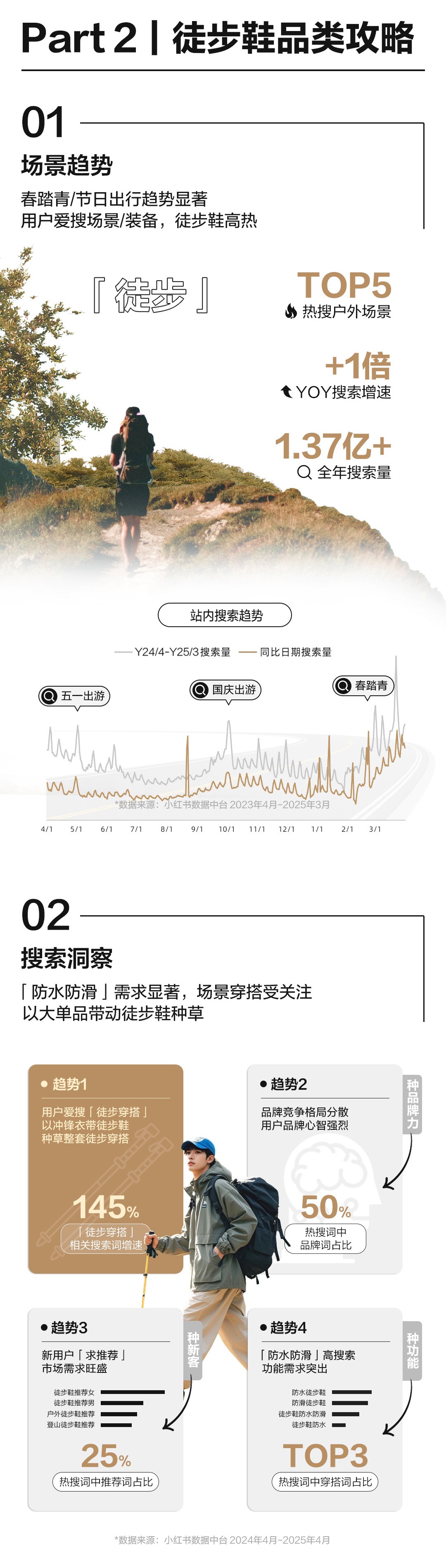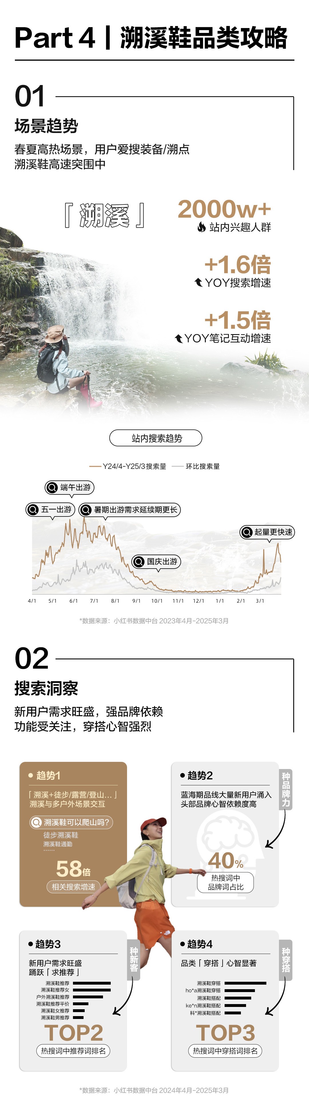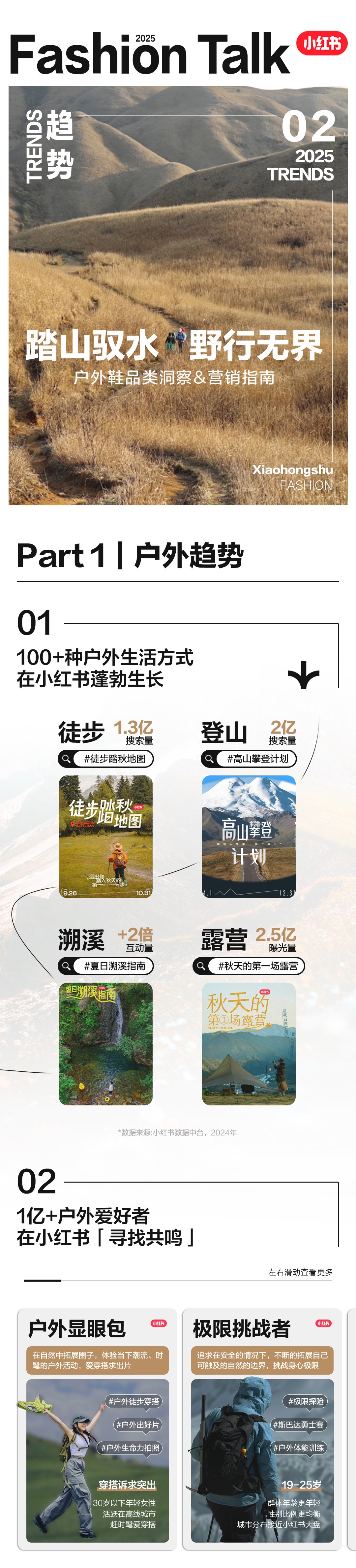 本期小红书带来「户外鞋品类洞察&营销指南」,通过对户外趋势的深度洞察,聚焦户外鞋品类中「徒步鞋、登山鞋、溯溪鞋」三大热门品类,从场景需求、搜索动向、内容趋势到策略打法,全方位拆解品类增长密码。为品牌提供从精准定位到高效转化的全链路营销指南,助力品牌把握户外场景趋势,抢占品类增长制高点。