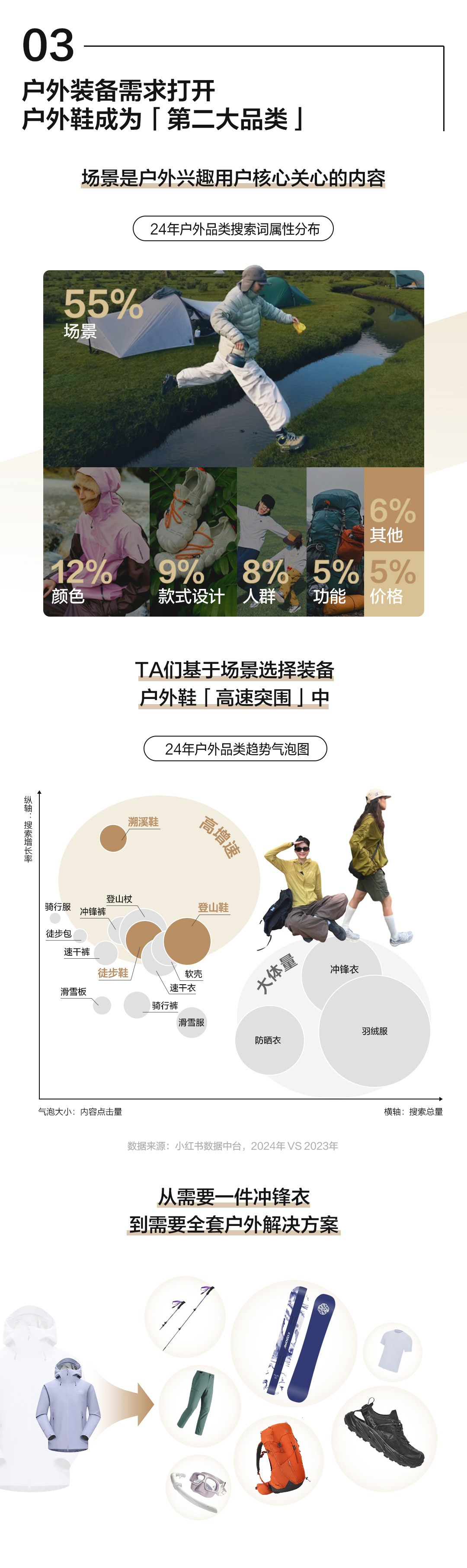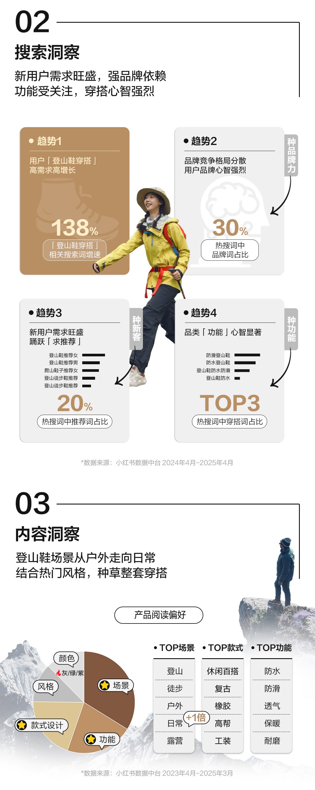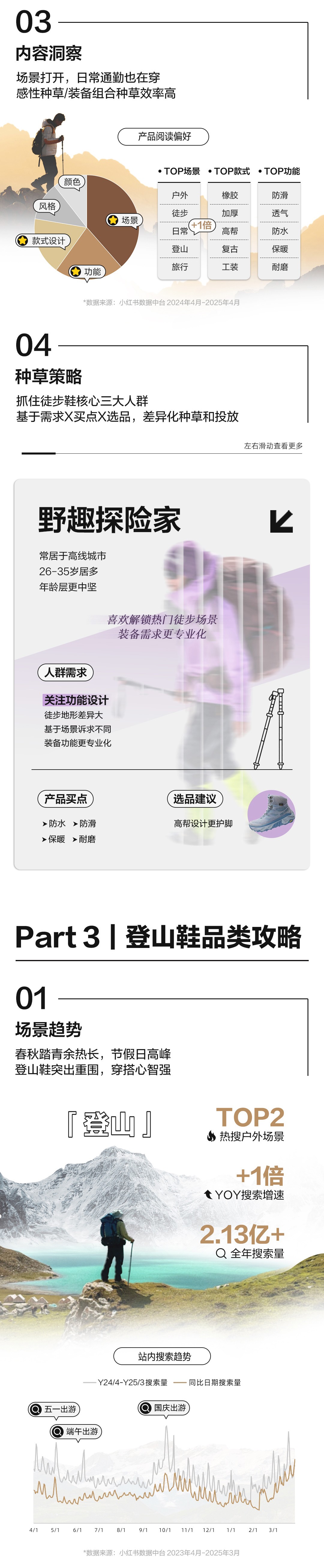 从24年户外品类搜索词属性分布来看,户外兴趣用户的需求已从单一冲锋衣转向鞋/裤/包等全套户外装备,户外装备需求被全面激活。其中,户外鞋凭借精准的功能细分与场景适配能力,跃升为仅次于户外服装的第二大品类,展现出强劲的市场潜力。小红书基于平台中海量内容洞察,精准捕捉人群需求,帮助众多户外运动品牌预判趋势风向,构建从内容种草到消费转化的全链路营销矩阵,实现品牌声量与销量的双重跃升。